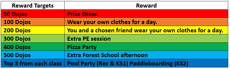 Pupils are awarded a dojo for their positive behaviours. Dojos are awarded by staff when they demonstrate: